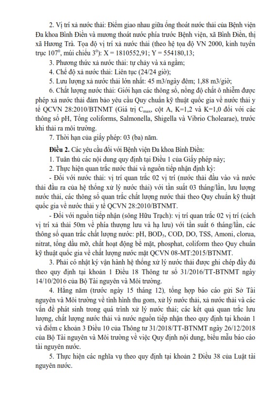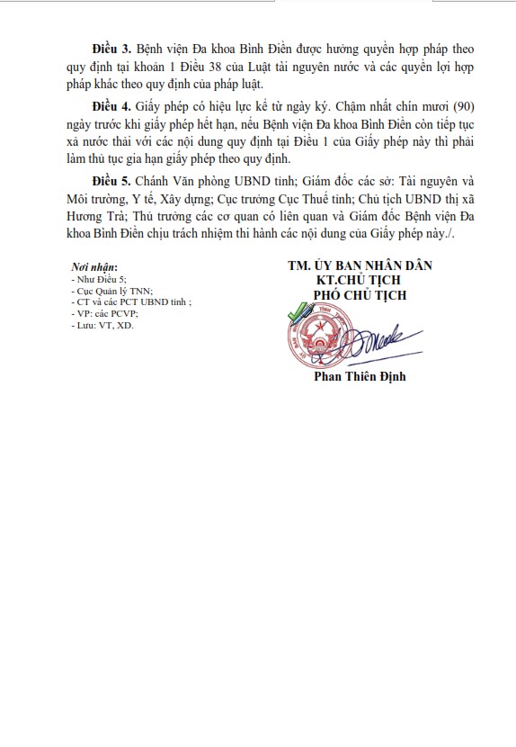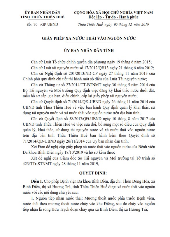 UBND tỉnh Thừa Thiên Huế cấp Giấy phép xả thải vào nguồn nước cho Bệnh viện Đa khoa Bình Điền